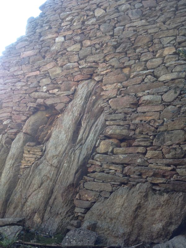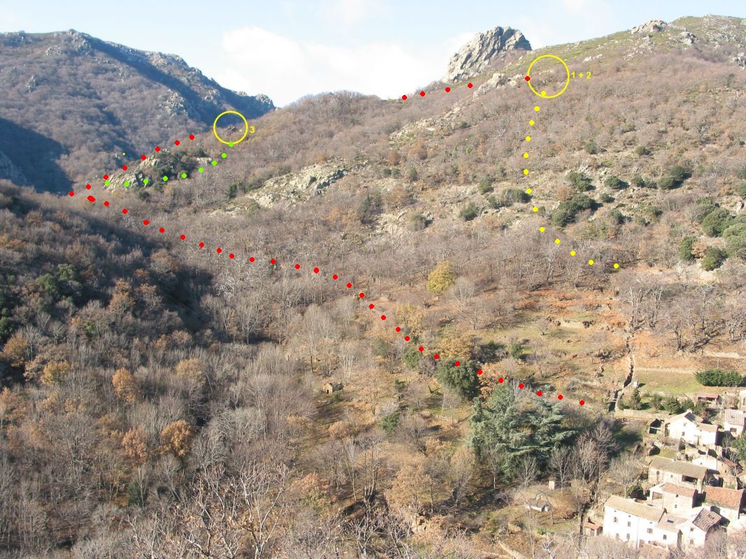 | Weg Nr. 1 "quer durchs Gelände" (gelb) Der Weg beginnt bei der westlichsten Kehre der oberen Straße, in deren Nähe derzeit (Frühjahr 2015) noch ein Bienenkasten steht (Abb. 3). Zuerst folgt man den Spuren eines Jägerpfades in den Wald, weicht dann nach rechts oben ab und steigt Terrasse für Terrasse höher, durch den Wald in nord-nordwestlicher Richtung ansteigend. Zwar gibt es Markierungen mit kleinen Steinmännchen (cairns), diese kann man jedoch leicht übersehen. Bald kann man durch die Bäume oberhalb der Baumgrenze einen großen Felsen erkennen (4). Das Gelände verführt dazu, eher zu weit links zu gehen, dieser Felsen kann als Anhaltspunkt dienen: die Ruinen befinden sich an seinem von unten gesehen rechten – östlichen – Rand. Wenn man diesen Felsen über sich erblickt, hat man einen guten Anhaltspunkt: Am besten, man steigt zunächst auf diesen Felsen zu. Nach etwa zwanzig bis dreißig Minuten kann man die Mauern der unteren der beiden Ruine durch die Bäume sehen. (5) |