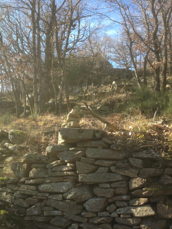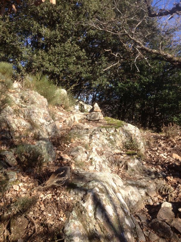 | Weg Nr. 3 (grün) Ebenfalls "quer durchs Gelände" führt eine Variante, die an einer weiteren, selten aufgesuchten Bergerie-Ruine vorbeiführt. Hier braucht man etwas Orientierungsvermögen, da kein richtiger Weg zu dieser einsamen Ruine führt. (Es ist hilfreich, wenn man sich ihre Lage vorher einmal vom gegenüberliegenden Berg, z.B. von Klaus' Grab, angeschaut hat. Hat man sich ihre Lage einprägt, ist sie eigentlich kaum zu verfehlen – s. Abb. 2) Man geht wie oben bei Weg Nr. 2 beschrieben am Col de Grousset ebenfalls nach rechts, verlässt den Weg aber schon nach etwa 50 Metern bei einer Steinmarkierung (Abb. 13) nach rechts. Ein kurzes Stück ist hier noch ein Fußpfad erkennbar, dann verliert er sich im Wald. Am besten, man hält sich immer aufwärts, evtl. leicht nach rechts. Das Gelände ist gut begehbar, überall sind die alten Terrassenmauern sichtbar, und nach etwa einer Viertelstunde erscheint die Ruine im Wald (14). |