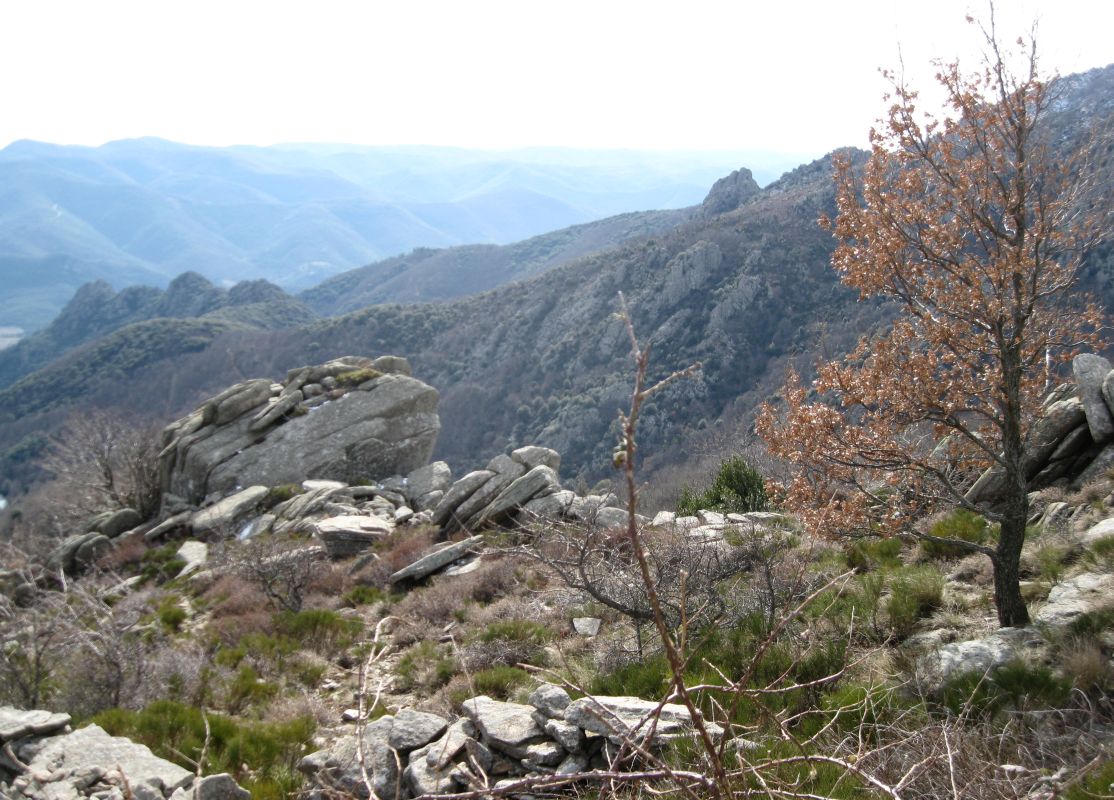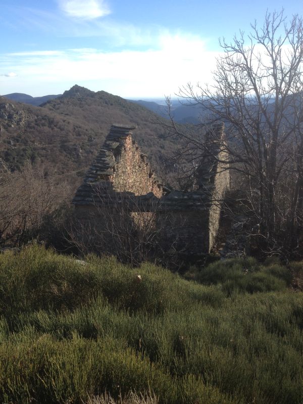 | Folgt man dem Mulipfad (8) aufsteigend in nördlicher Richtung, bieten sich schöne Blicke hinunter ins Tal des Ruisseau de la Roque (9). Nach etwa 10 Minuten erreicht man, sobald man den Wald wieder verlassen hat, eine Art kleinen Pass mit einem Felsen zur Linken, mit Ausblick auf den obersten Teil des Ruisseau de la Roque. In der Ferne erkennt man den schrägen Felsturm des Château de la Roque (10). Von hier würde der weitere Weg wieder abwärts führen, er geht noch ein Stück weiter das Tal hinter, dann verliert er sich im Geröll. Wir verlassen ihn aber jetzt, an seiner höchsten Stelle, nach rechts und steigen den steilen unbewaldeten Hang in der Falllinie aufwärts. Der Weg ist mit vielen kleinen Steinmännchen (cairns) markiert, die hier gut zu sehen sind. Links über dem Hang erhebt sich der Roc de Tauteylle (11). Nach etwa zehn Minuten erreicht man das obere Ende des Hanges. Gerade vor uns ist ein kleines Wäldchen, eigentlich mehr Gebüsch, dahinter verbergen sich die Ruinen der Bergerien. Man hält sich links (aufwärts Richtung Tauteylle – nicht durch das Gebüsch gehen!), bis die Ruinen sichtbar werden (12), dann kann man im Bogen zu ihnen hinübergehen. Von Bardou 30 – 40 Minuten. | |||||||