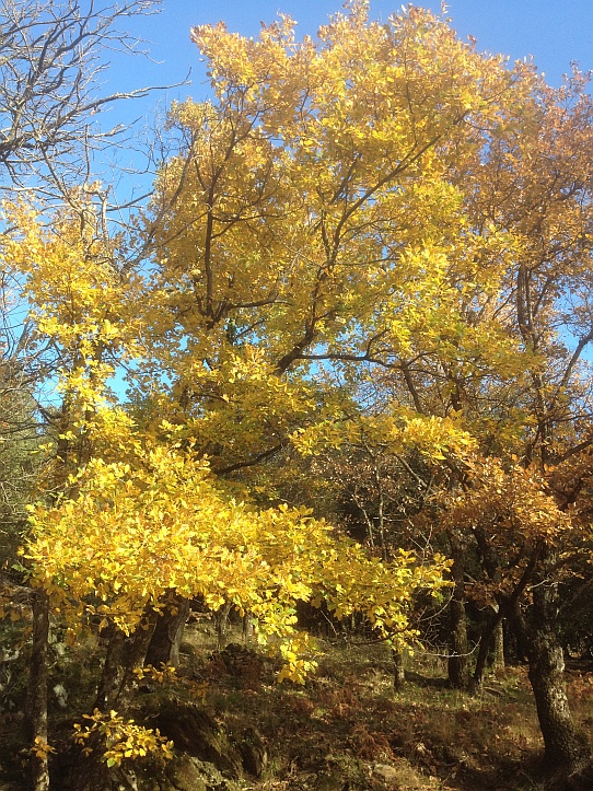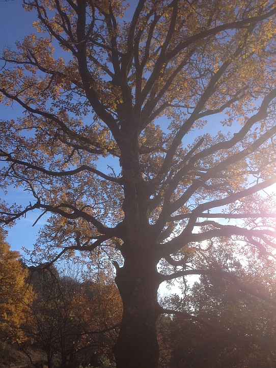 Dass dieses Jahr vom Wetter her (aber nicht nur da!) ein ganz besonderes war, hat jeder auf seine Weise bemerkt. Die Bäume zeigen es auf ihre Art. Mir sind im Herbst die Farben aufgefallen, schon im Schwarzwald, jetzt auch hier. Nie habe ich die Eichen so leuchten sehen wie in diesem Jahr. Goldener Dezember. |