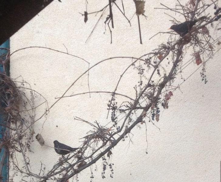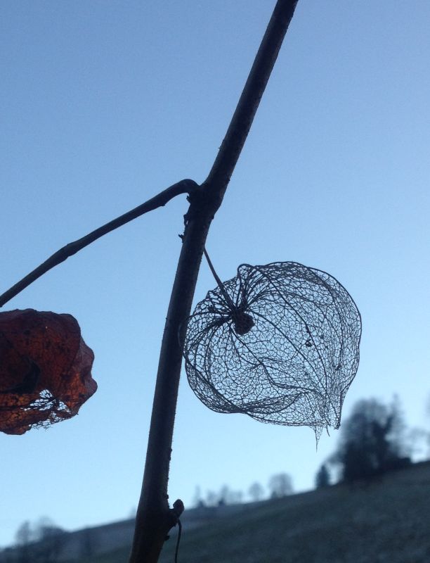 | Hier geht inzwischen der Herbst langsam in den Winter über. Die Amseln ernten auf dem Balkon die übriggebliebenen Trauben, und durch die Gerippe der Physalisblüten kann man den Himmel sehen. | |||||||||||