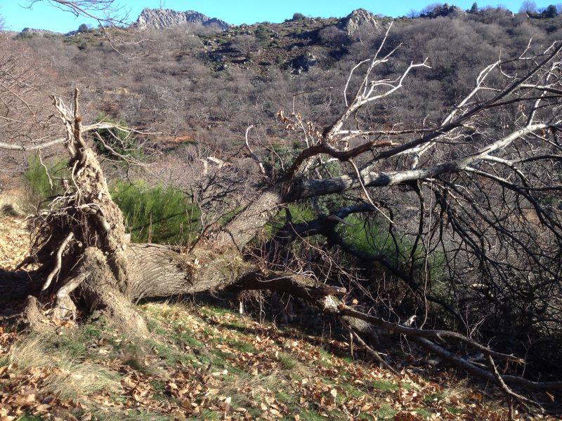 | Bei beiden Geschenken handelt es sich um verwilderte Edelkastanien, die aus Schößlingen ihrer (kultivierten) Elternbäume gewachsen waren. Da diesen Wald seit hundert Jahren keiner mehr pflegt, wächst alles, was wachsen will, wild durcheinander. Früher waren die Edelkastanien die Hauptkultur dieser Region, beinahe jeder Baum hatte seine eigene Terrasse. Die wilden Nachkommen wachsen meist irgendwo auf schrägem Untergrund, manchmal auch mitten in alten Terrassenmauern, und haben keinen guten Halt im Boden. Sie erreichen nur noch einen Bruchteil des Alters ihrer Eltern. | |||||||||||