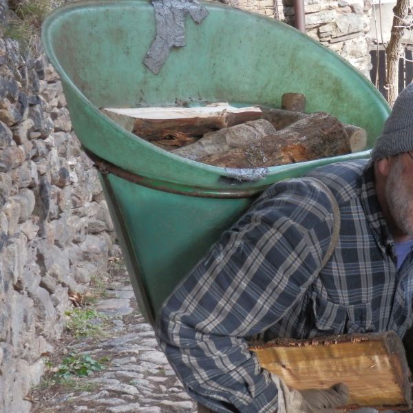 Die alljährliche Wintersportsaison ist eröffnet. Vier Ster trockenes Buchenholz, auf 35 Zentimeter Länge geschnitten (für meinen Ofen), wollen vom Abladeplatz am Dorfeingang bis zu meinem Holzschuppen (aufwärts!) verfrachtet werden. In eine Kiepe (dieses Ding, womit während der Weinlese die Trauben eingesammelt werden/wurden, und das etwa fünf Kilo wiegt) passen ca. 20 Kilo Holzscheite rein (eigentlich viel mehr, aber das ist inzwischen meine Grenze, dazu klemme ich unter jeden Arm noch ein Trumm à 2,5 kg). Ein Ster trockenes Buchenholz wiegt zwischen dreihundert und vierhundert Kilo, wobei mein Brennholzlieferant wie hier üblich unter Ster den sogenannten Frage: wieviele Schritte muss ich laufen (einschließlich Rückweg), bis die vier Ster bei mir im Schuppen sind? (Ich habe keine Ahnung.) |