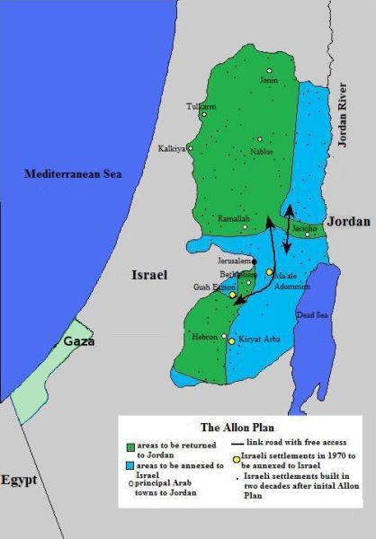 | Teilungsplan von Jigal Allon 1967. Die Siedlungen der Palästinenser sollten damals noch an Jordanien gehen, von einem palästinensischen Staat war keine Rede. |