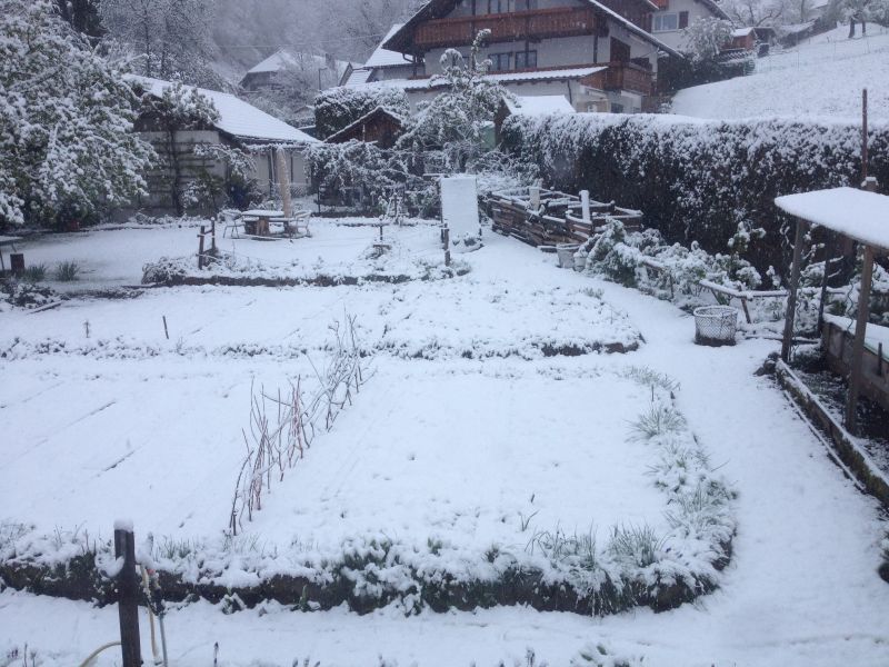 Heute Morgen gab es so einen merkwürdig hellen Schein vor dem Fenster. Ein Blick in den Garten und auch auf die andere Seite, von der Terrasse, sagt mir: Was ich sehe, passt nicht zum Datum – eines von beiden muss falsch sein.