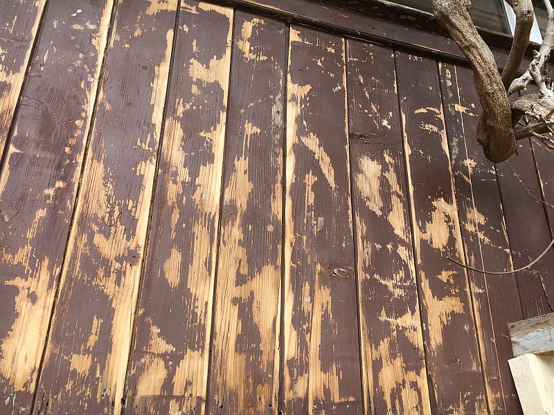 | Bretter der Fassadenverkleidung, vorbereitet für den neuen Anstrich |
