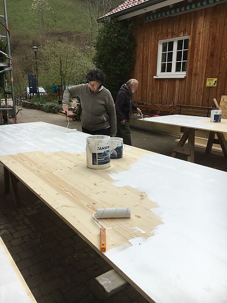 Rund ums Dach wird alles erneuert. Wir können selber einiges machen, zum Beispiel Sperrholzplatten streichen, aus denen neue Bretter für den Ortgang geschnitten werden. (Bei der Gelegenheit habe ich das Wort neu gelernt.)