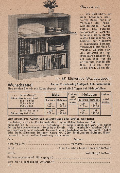 Unverhofft flattert mir eine Wilhelm-Busch-Gesamtausgabe aus den Fünfzigerjahren ins Haus. Aber nicht vom Inhalt derselben will ich berichten, sondern von einem eingelegten Werbezettel des (längst nicht mehr existenten) Fackel-Verlags, der seinen Lesern praktischerweise auch gleich Möbel zur Unterbringung der Bücher anbot. Die Kapazität war allerdings nicht üppig, wie man aus der Abbildung ersehen kann. Wäsche und Geschirr sollten auch noch im Bücherboy Platz finden. Der/die durchschnittliche Deutsche las offenbar nicht so viel. Irgendwie rührend (wie manches aus den Fünfzigern).