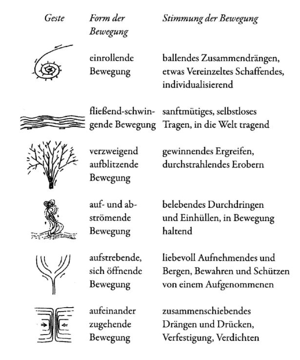 Beobachtungen Worauf treffen wir nun, einer Pflanze zugewandt, in der beschriebenen Weise vorbereitet und mit etwas Glück, was die äußeren Bedingungen angeht? – Auf Bewegung! Dort um die Pflanze herum rührt sich etwas. Natürlich nicht ein Pflanzenteil, auch kein Insekt, überhaupt nichts Physisches, Begrenztes, Verdichtetes, Materielles. Nein, die Umgebung der Pflanze ist von Bewegungen durchzogen. Dieser erste Eindruck ist nur vergleichbar mit einem Luftzug, einem Windhauch: Wir sehen ihn nicht, empfinden ihn nur (mit anderen Sinnesorganen), und er ist ungemein flüchtig. So auch die Bewegungen um die Pflanze: zart, flüchtig, kaum zu bemerken, kurz vollzogen und schon wieder vorbei, vielleicht abgelöst von anderen Bewegungen, die ebensowenig deutlich sind – alles kaum greifbar. Wenn man jetzt nicht im Hintergrund seines Denkraumes* seine wachen Gedanken bereit hat, die diesen so unbedeutenden, so zarten, flüchtigen und auch fremden Eindrücken ihre wahre Bedeutung zumessen und zu halten verstehen, dann wendet man sich wieder von ihnen ab, zurück zu den kräftigen Sinneseindrücken, die man so wohltuend angenehm gewöhnt ist, und bemerkt dieses Abwenden vielleicht noch nicht einmal. Können aber unsere Gedanken der Beobachtung die rechte Bedeutung zumessen und uns zu weiterer Anstrengung und Durchhaltebemühungen befeuern – denn davon hängt der Fortschritt an dieser Stelle ab –, dann können wir durch wiederholte Hinwendung zur Pflanze, durch gesteigerte Konzentration einige genauere Eindrücke der Bewegungen erhalten. Es zeigt sich zunächst, dass die Bewegungen sich in der Beobachtung wiederholen. Dabei durchlaufen sie eine bestimmte Form. Dazu kommen weitere Eindrücke: Die Bewegungen haben Kraft. Sie haben gezielte, gerichtete, formende Kraft. Sehen wir einen Vogel durch die Luft fliegen, wissen wir so gut wie nichts von den physikalisch-dynamischen Wechselwirkungen zwischen Flügel und Luft. Das können wir uns nur erschließen durch Erfahrungen mit Sturm und Wind am eigenen Körper oder mit angefertigten Modellen wissenschaftlich denkend uns erarbeiten. Aber direkte Wahrnehmung haben wir keine, ebensowenig wie wir die Kräfteverhältnisse in der Statik eines Baumes oder Hauses wahrnehmen können. Das ist bei der Wahrnehmung lebendiger Kräfte ganz anders. Jede Bewegung nehmen wir unmittelbar wahr als kraftgeladen, wir erleben ihr "Schaffen", so seltsam es klingt, ihr "Fleißig-Sein". Es sind demgegenüber die Kräfte des Physischen – sei es ein noch so gewaltiger Stoß im Bereich der Physik, eine noch so effektvolle chemische Reaktion, eine noch so kunstvoll kombinierte Kette von elektrischen Impulsen im Bereiche der Technik – etwas außerordentlich Stumpfes, Taubes und Monotones. Das Kraftvolle in den lebendigen Strömen ist zunächst kaum, bei Vertiefung der Beobachtung immer stärker wahrzunehmen und kann bei intensiver Zuwendung so eindrücklich werden, dass man sich vor einer zu starken Beeinflussung der eigenen Lebenskräfte schützen muss. Ein weiterer Eindruck ergibt sich so: Die kraftenden. formenden Bewegungen haben einen Charakter, einen für jede Bewegung typischen Charakter. Anders formuliert: Der Charakter einer Bewegung setzt sich zusammen aus seiner Bewegungsform und seiner "Stimmung", in die diese Bewegung getaucht ist. Beides zusammen könnte man als "Geste" bezeichnen. Auf der folgenden Seite seien einige Beispiele gegeben. Die Bewegungsformen sind oft leicht zu erkennen und zu übermitteln, die Stimmungen sind – wie die Beispiele schon zeigen – nicht leicht zu benennen und auch in der Beobachtung bisweilen sehr schwer zu ergründen. Hier zeigt sich sehr schnell die extreme Beschränktheit des menschlichen Fassungsvermögens für solche Erfahrungen. Nur durch oft wiederholte Zuwendung und liebevolle Hingabe bilden sich beim Beobachter neue Haltungsformen aus, mit denen er die vielen ungewohnten Charaktere aufnehmen und begreifen kann. Einen ersten Schritt vollzieht der Beobachter, wenn er hinter der physischen Welt, im Verblassen der sinnlichen Eindrücke, die strömenden schaffenden Bildekräftebewegungen hereinwirken sieht. In dieser Welt kann er sich lange aufhalten, immer neue, immer kompliziertere Bildekräftekomplexe sich erarbeiten. Die erstaunlichsten Dinge wird er an den einfachsten Pflanzen erleben können, die verblüffendsten Querverbindungen und &AUuml;bereinstimmungen wird man an weit entfernt liegenden Naturgegebenheiten finden. Ein weiterer Schritt ist nötig, um von der Welt der Bildekräfte in die Welt der (Elementar-)Wesen zu gelangen. Durch weitere Vertiefung der Beobachtung, weitere Steigerung der Konzentration und Ausdauer erscheinen dann Wesenheiten. Einzelne oder wenige oder nicht zählbar viele Wesen sind in diesem Bewegen, Strömen, Kraften anwesend, wohnen da, bevölkern diese Kräftewelt. Wesen mit einem seelischen Kern – nicht mit einer veränderbaren, gestaltbaren Seele wie beim Menschen – leben und schaffen innerhalb der Bildekräfte. Die kraftende Seite der Bildekräfte und ihre seelische Durchwesung gehören zusammen wie die zwei Seiten einer Münze. Man kann sie so oder so herum anschauen. Doch ist die Wahrnehmungsart für die Kräfte eine andere als für die Wesen. Der Wechsel von der einen in die andere ist eine Art Umstülpen, Durchstoßen oder Hindurchgehen, jedenfalls ein diskontinuierlicher &AUuml;bergang. *Gemeint ist der ätherische Denkraum, nicht die Gehirnschale. Die Entdeckung des eigenen Denkraumes ist sozusagen eine Nebenwirkung der Beobachtungsbemühungen. ![]() Die scheinbare Vertrautheit einiger dieser Zeichnungen darf nicht zu dem Irrtum verleiten, man würde diese Formen so in der Beobachtung sehen. Es ist ganz anders: Man erlebt lebendige Kräfte in diese Formen hineinschaffend. | ||||