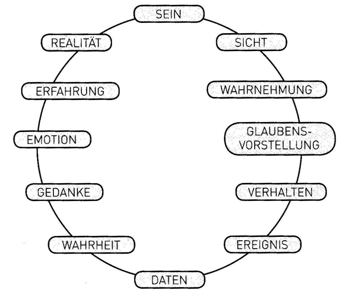 Sicht + Wahrnehmung + Glaubensvorstellung + Verhalten + Ereignis + Daten + Wahrheit + Gedanke + Emotion = Erfahrung = Realität